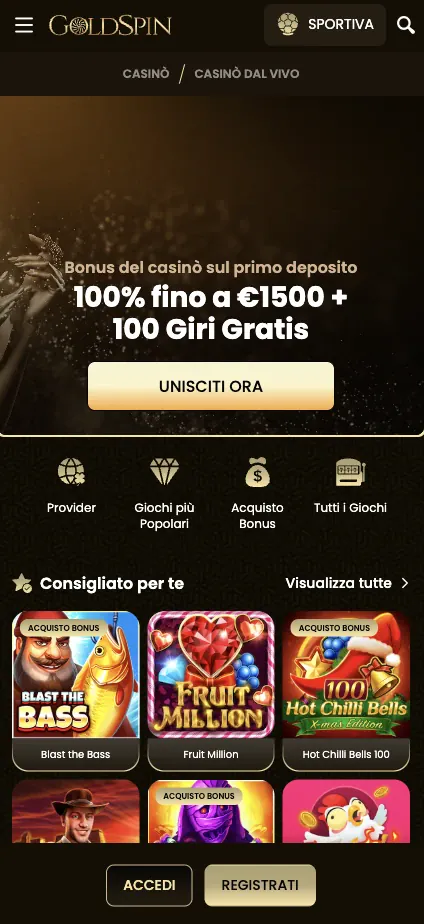 Se il tuo interesse principale sono le slot Goldspin casino, puoi filtrare per tema, funzionalità o provider per restringere rapidamente la lobby. Offriamo anche accesso alle promozioni da mobile, inclusa la welcome package Italia: 1° deposito 100% fino a €1.500 + 100 Free Spins (min €10, wagering 35x deposito+bonus e 40x Free Spins), poi 75% fino a €1.000 sul 2° deposito e 125% fino a €500 sul 3° deposito (min €10, wagering 35x deposito+bonus).
